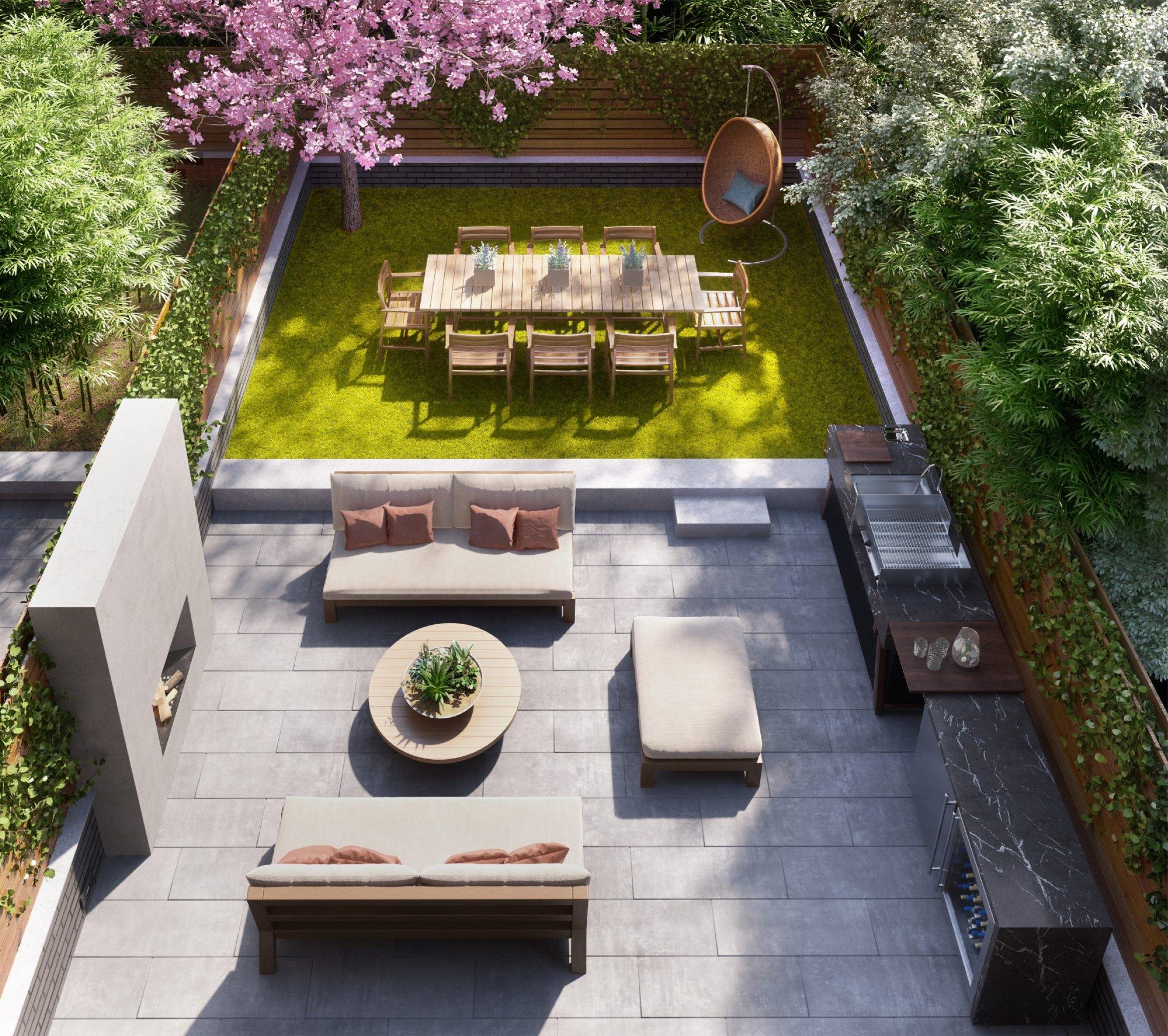 The private green, surrounded by teak and stone pavers, can accommodate an outdoor kitchen, a fireplace, cabana style seating, and an al fresco dining table.